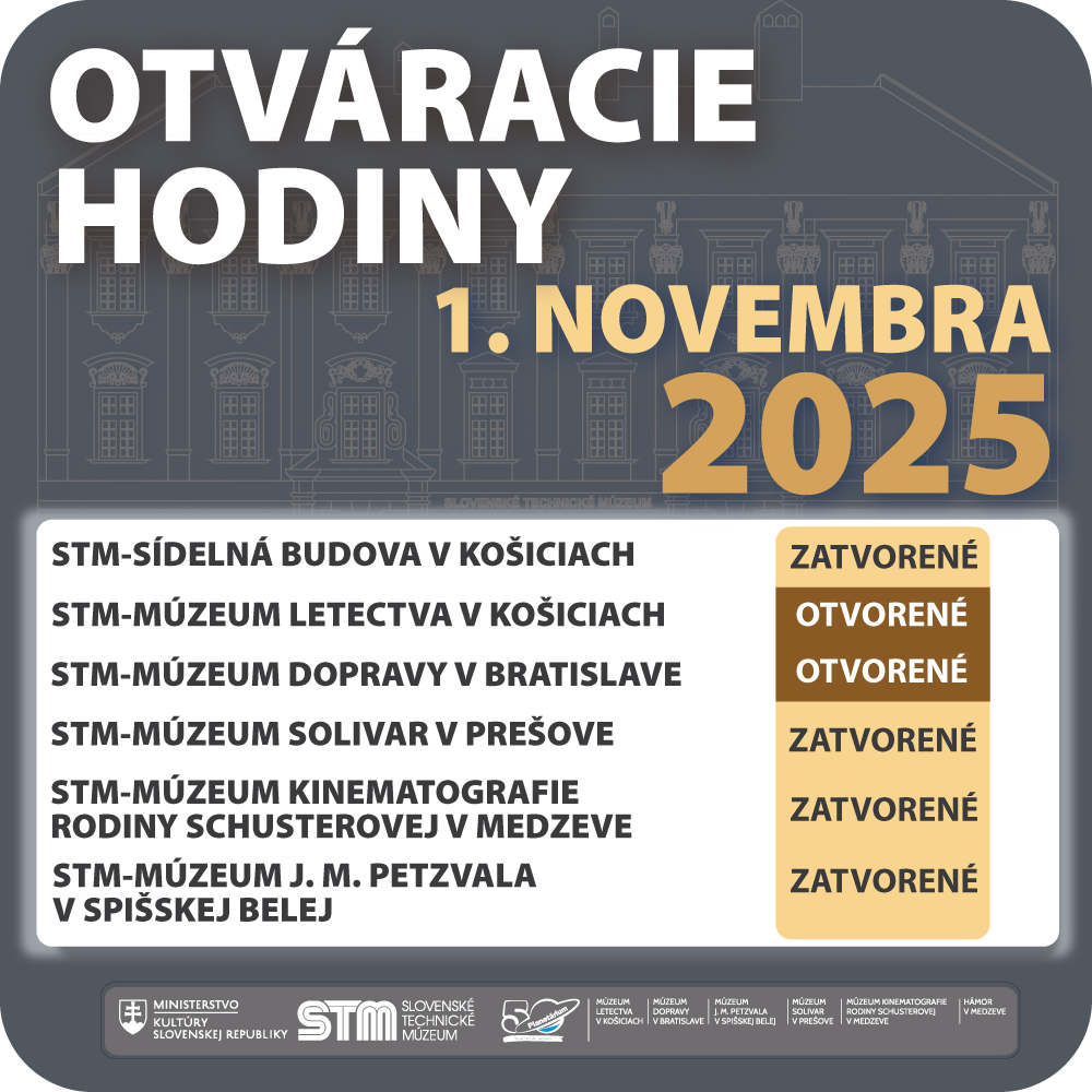 Vážení návštevníci, počas štátneho sviatku 1. novembra 2025 bude Slovenské technické múzeum a jeho pobočky otvorené/zatvorené takto: