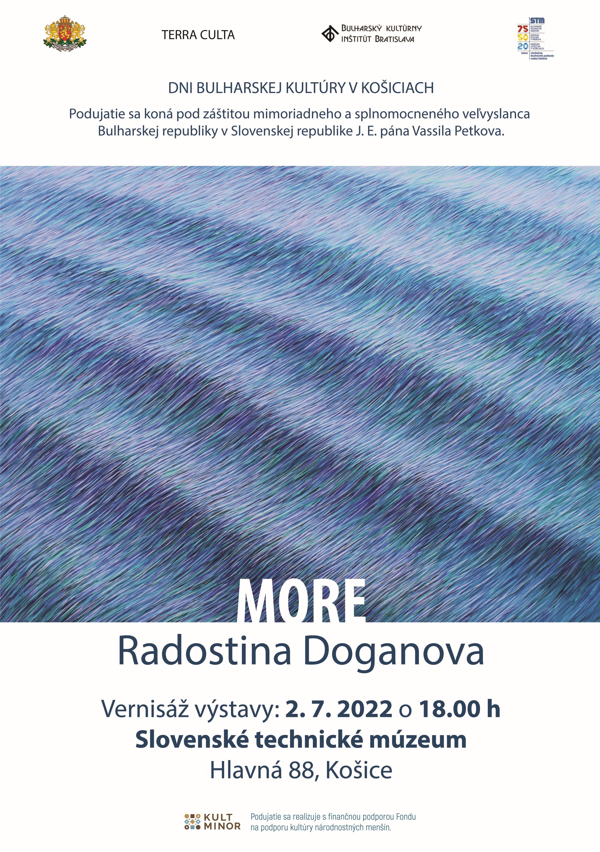 Slovenské technické múzeum Vás v rámci podujatia Dni bulharskej kultúry v Košiciach pozýva na výstavu obrazov autorky Radostiny Doganovej pod názvom More, ktorá bude návštevníkom sprístupnená od 3. júla 2022 vo výstavných priestoroch STM a na koncert orchestra Sinfonietta dell'Arte pod vedením dirigenta Konstantina Ilievskeho, ktorý sa uskutoční dňa 2. júla 2022 v čase od 18.00 – 20.30 hod.