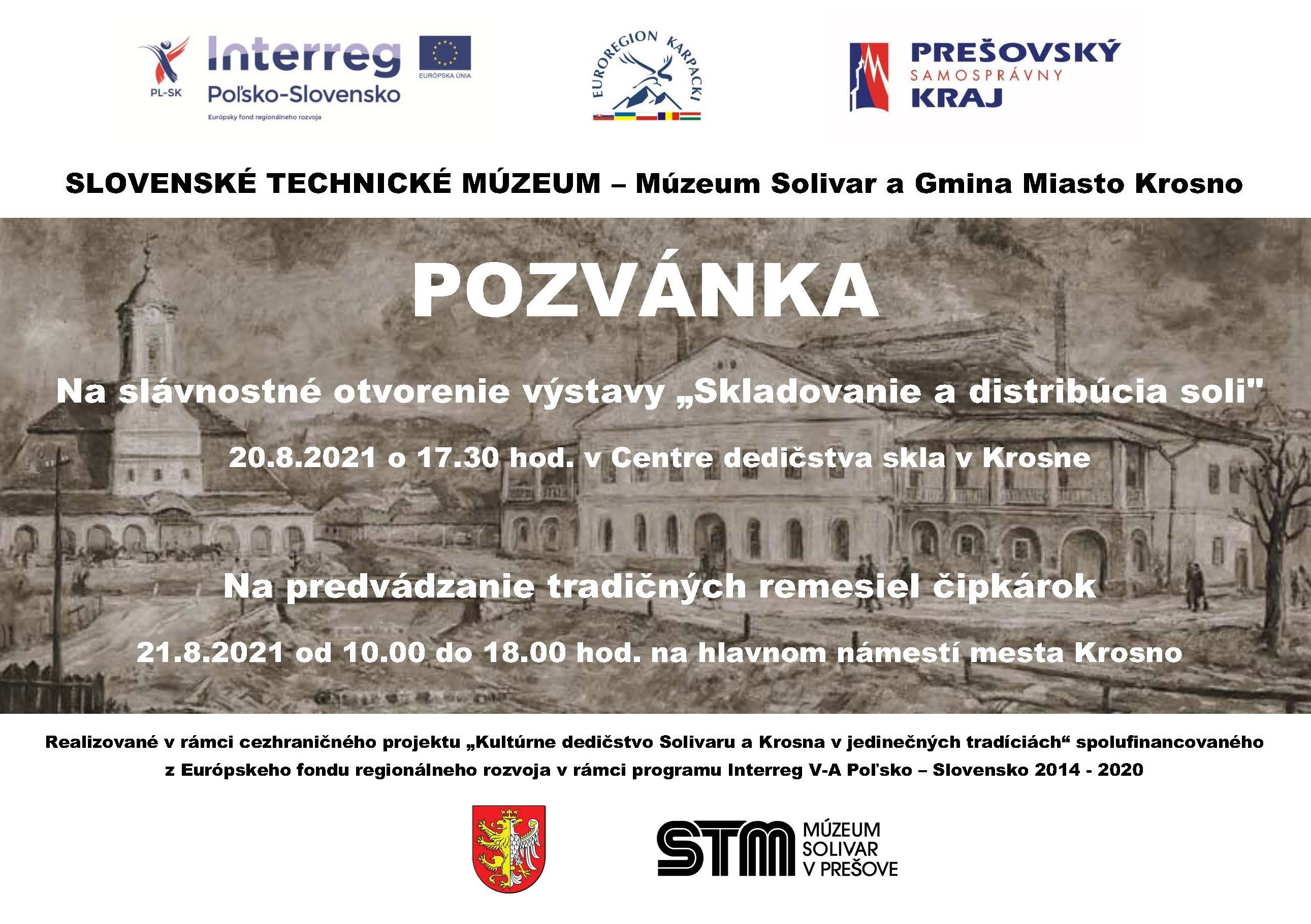 Pozvánka na otvorenie výstavy Skladovanie a distribúcia soli a workshop v Krosne realizované v rámci cezhraničného projektu Kultúrne dedičstvo Solivaru a Krosna v jedinečných tradíciách spolufinancovaného z Európskeho fondu regionálneho rozvoja v rámci programu cezhraničnej spolupráce Interreg V-A Poľsko – Slovensko 2014 – 2020.