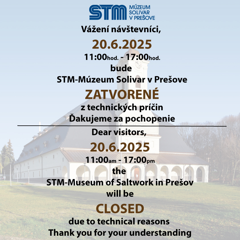 Vážení návštevníci, dňa 20.6.2025 bude STM-Múzeum Solivar v Prešove zatvorené z technických príčin.