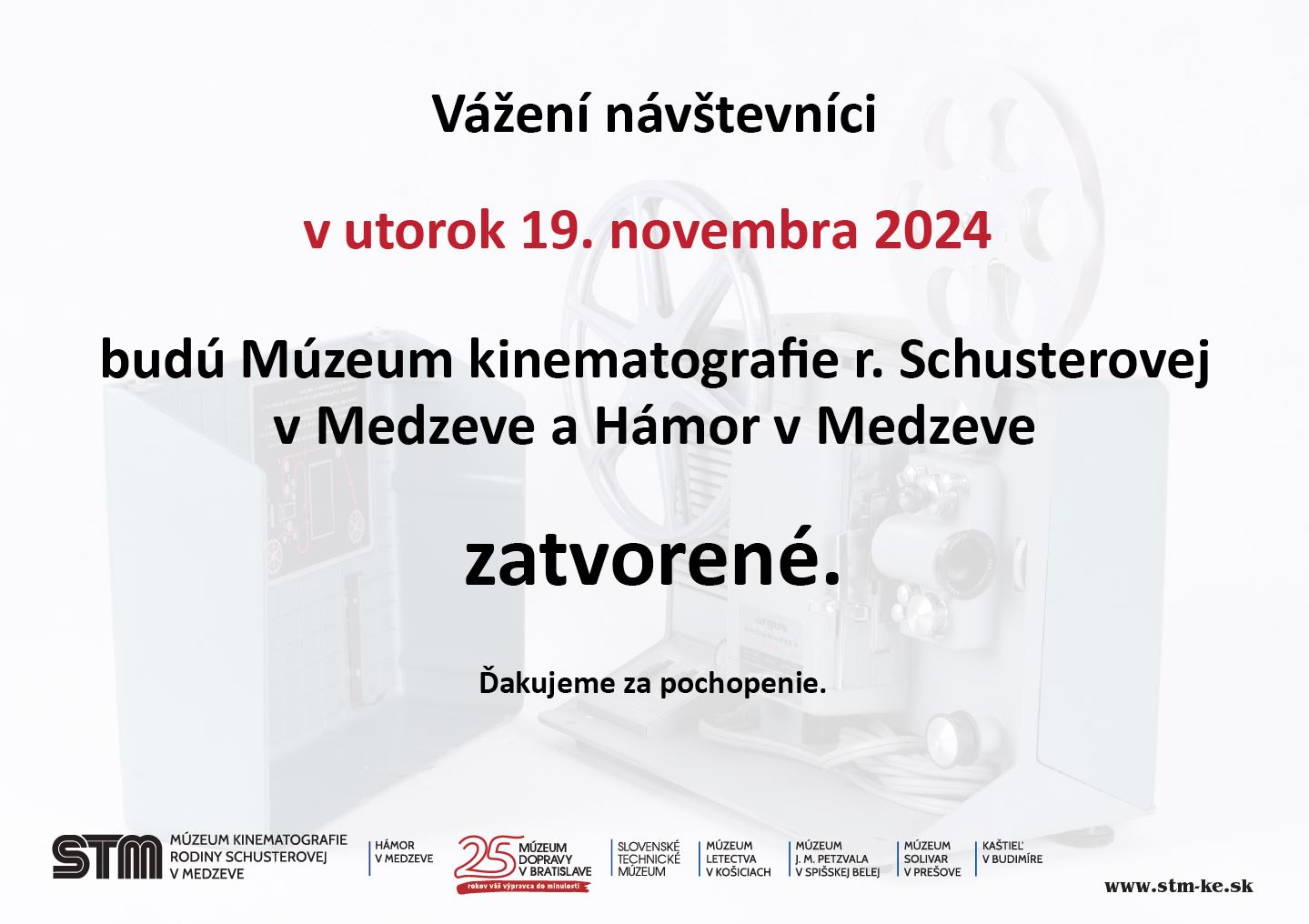 Oznamujeme návštevníkom, že Múzeum kinematografie rodiny Schusterovej a Hámor v Medzeve budú v utorok 19. novembra 2024 ZATVORENÉ. Ďakujeme za pochopenie.